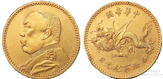 五、 1916年袁世凱像中華帝國洪憲紀元飛龍拾圓金幣非簽字版:拍賣出現金幣銀樣1枚,金幣十餘枚(有2種不同重量)。